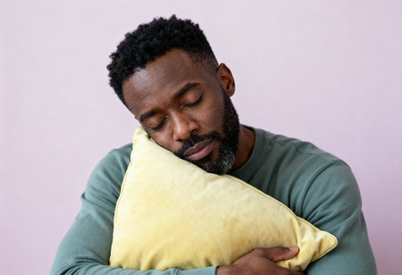 relaxed man in green shirt napping while hugging soft yellow cushion against pastel background, showing peaceful indoor rest.