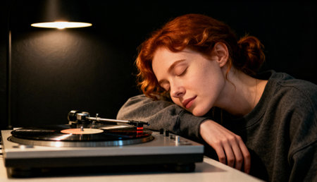 Young woman with red hair relaxing and enjoying calming music alone while resting her head beside a vinyl record player in a cozy room.