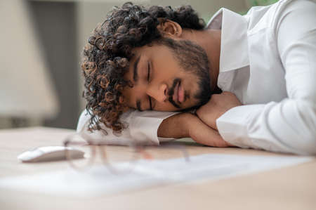 Weary male office employee taking a nap on the workplace. Overworked businessman feeling lack of sleep as a result of excessive exertion. Tired guy feels burnout concept