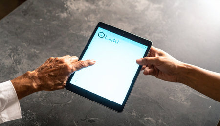 A close-up view from above shows two people collaborating over a digital tablet. One person, with intricate henna designs on their hand, points to the screen, guiding the other.