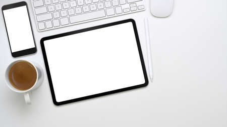 Top view of minimal workplace with digital tablet, smart phone, keyboard and coffee cup on white office desk.