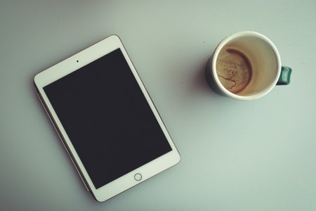 A top view shot of an empty mug and a blank tablet on a white surface with space for your text