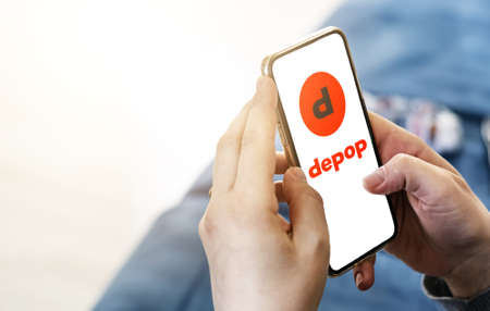 Rome, Italy, March 2022: Woman browsing Depop company website on her phone in her living room on a sunny day. Illustrative editorial. Realistic mockup. Selective focus.