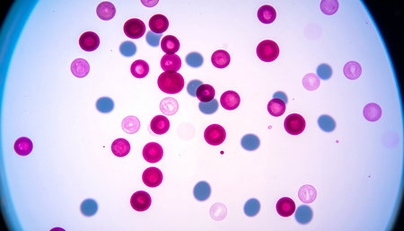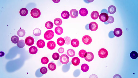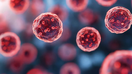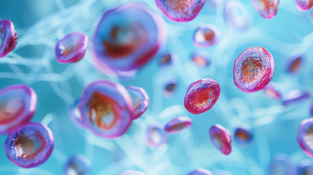 This macro image showcases red and blue spherical cells suspended in an abstract scientific background, ideal for themes of biology, health, and microscopic research.