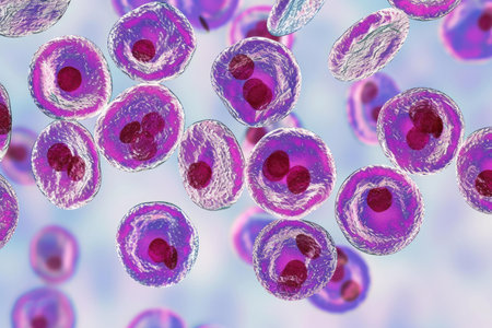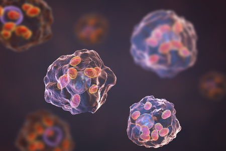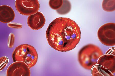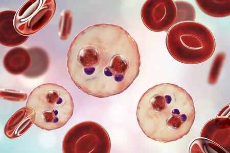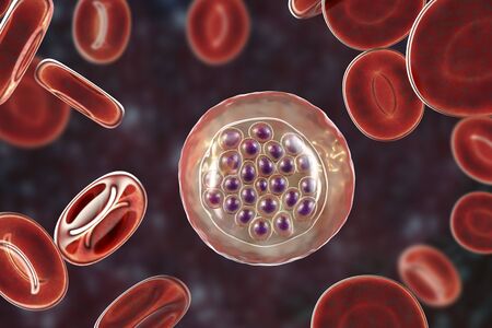 The malaria-infected red blood cells. 3D illustration showing malaria parasite Plasmodium falciparum in schizont stage inside red blood cells, the causative agent of tropical malaria
