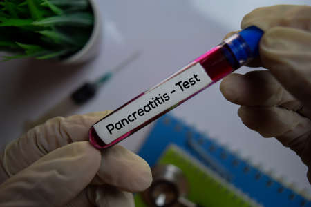 Pancreatitis - Test with blood sample. Top view isolated on office desk. Healthcare/Medical concept