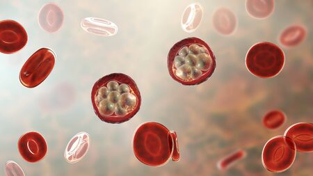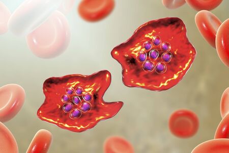 Red blood cells infected with malaria parasite, 3D illustration showing Plasmodium parasites inside red blood cells in the stage of schizont