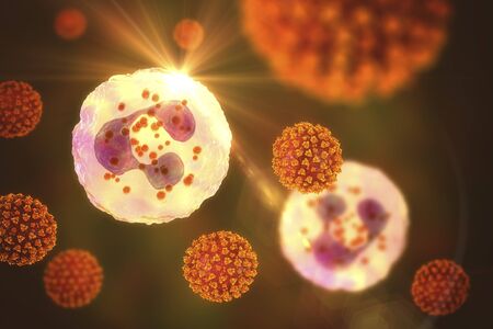 SARS-CoV-2 viruses activating neutrophil, conceptual 3D illustration. Overactive neutrophils in COVID-19 are associated with hyperinflammation that drives lung and multi-organ damage