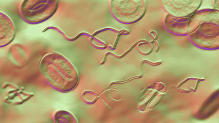 Borrelia bacteria in blood, 3D illustration. The causative agent of Lyme disease and relapsing fever. Borrelia recurrentis, B. burgdorferi in blood smear under microscope