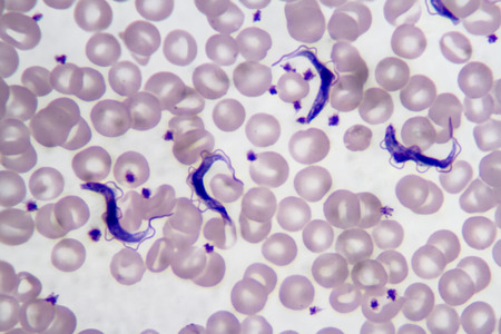 Trypanosoma gambiense blood smear viewed under a microscope at 1250 power.