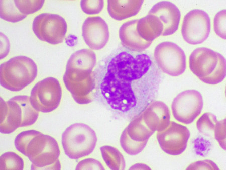 neutrophils. blood smear is often used as a follow-up test to abnormal results on a complete blood count (CBC) to evaluate the different types of blood cells.