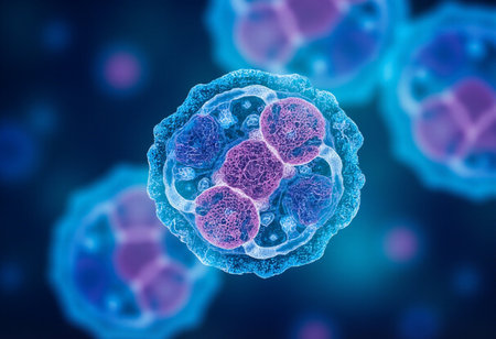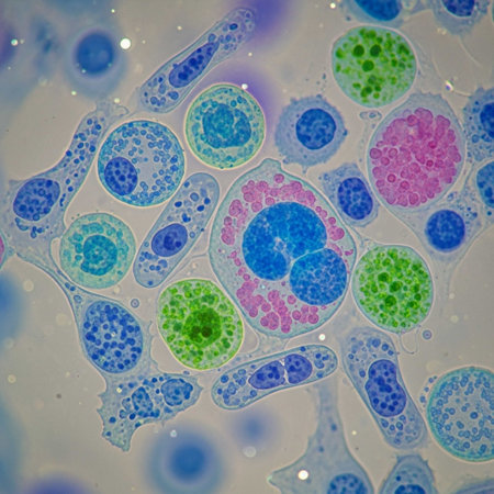 Microscopic close-up of vibrant stained human cells on a blue backdrop
