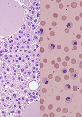 Histopathology of cirrhosis in blood smear, photo under microscope.