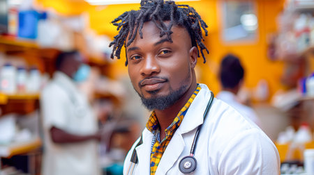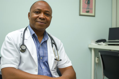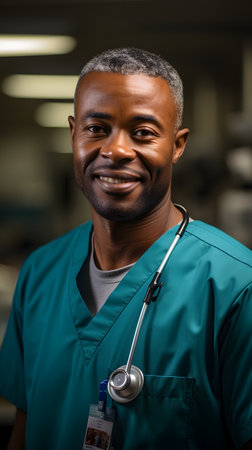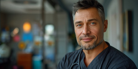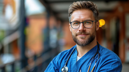 Confident male doctor in scrubs with a stethoscope, standing in a bright modern medical office, radiating professionalism and warmth