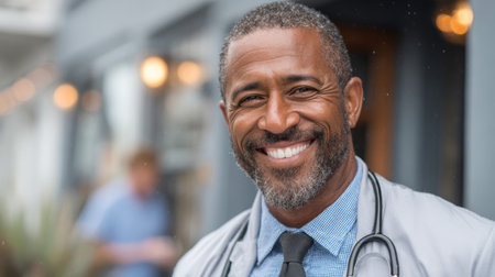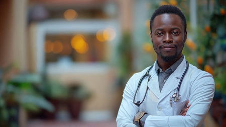 Smiling doctor with stethoscope in a stylish environment representing healthcare.