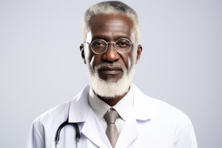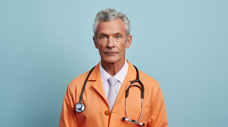Waist-length portrait of a male doctor in a white coat with a stethoscope around his neck on solid background, copy space