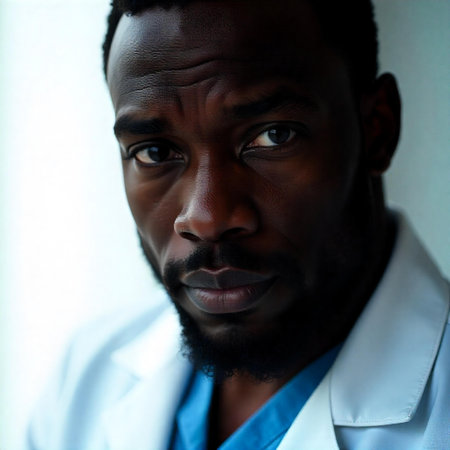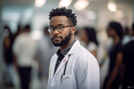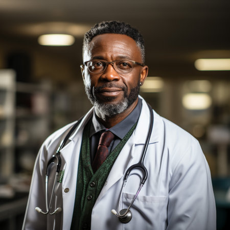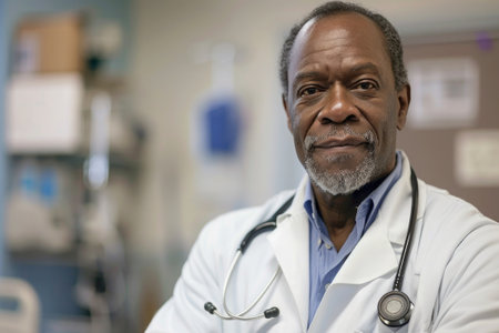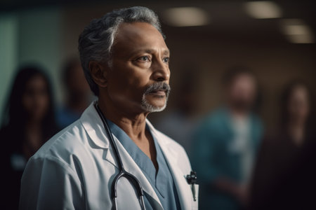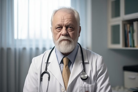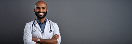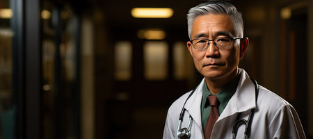 A serious physician stands confidently in a softly lit hospital corridor, wearing a stethoscope around his neck. He exudes professionalism and readiness to assist patients. Copy space.