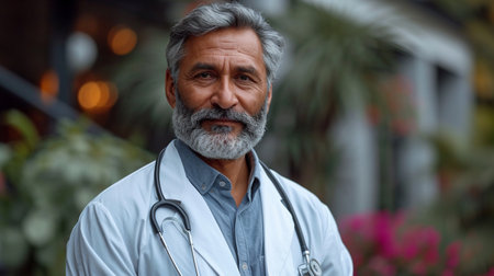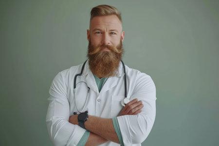 Exuding confidence and professionalism, a seasoned bearded doctor clad in a pristine white lab coat stands with arms crossed, a warm smile gracing his lips Amidst a vibrant green backdrop, he emanates a sense of trustworthiness and expertise as a beacon of medical care This captivating portrait captures the essence of a dedicated healthcare professional, inspiring trust and admiration AI Generative