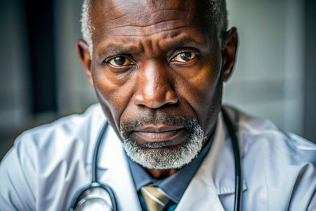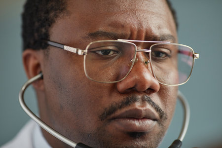 Portrait of Black middle aged man wearing glasses using stethoscope, focusing intently while listening during medical examination, close up of face and expression