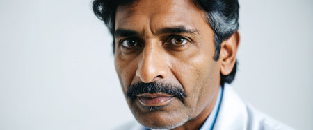 A man with a white coat and blue scrubs is looking at the camera with a stern expression