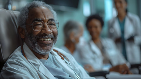 An elderly man is sharing a smile in a hospital chair, happy and content