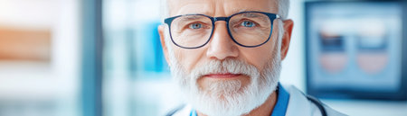 A confident mature male doctor with a beard and stethoscope smiles at the camera, conveying trust and experience. He is wearing a white lab coat and has his arms crossed.