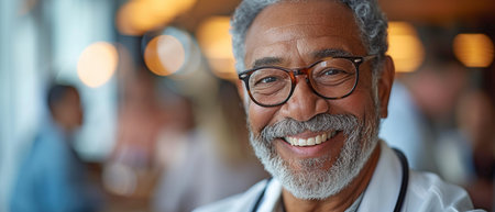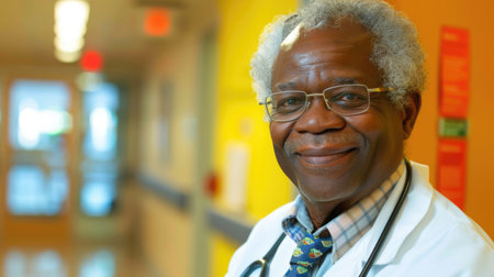 portrait of an elderly African-American male doctor in a white coat, smiling doctor with glasses on the background of a hospital corridor, grandfather