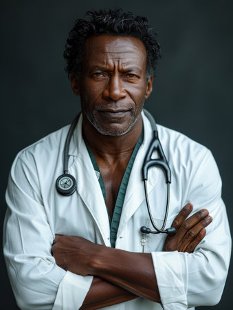 An experienced elderly doctor in a white hat and lab coat with a stethoscope stands with his arms crossed, looking seriously at the camera in a studio setting.