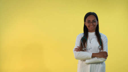 Black female doctor in lab coat smiling to the camera on yellow background. She is with stethoscope on shoulders.