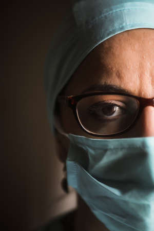 Close up portrait of female surgeon doctor wearing protective mask and hat during the operation. Healthcare, medical education, surgery concept.
