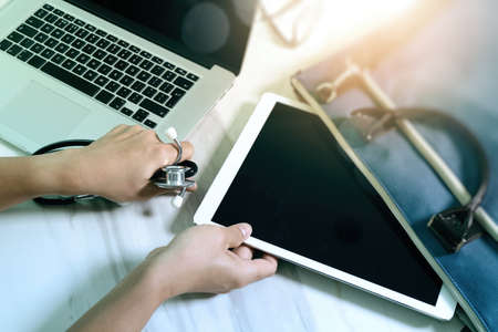 Medical technology concept. Doctor hand working with modern digital tablet and laptop computer and smart phone with medical chart interface. On marble desk, Sun flare effect photo