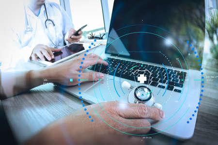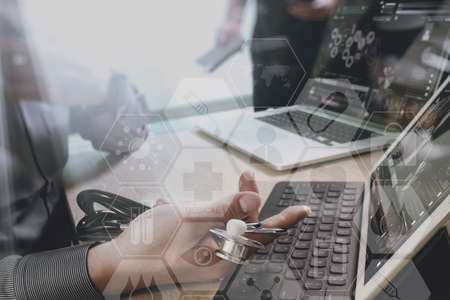 Medical technology network team meeting concept. Doctor hand working smart phone modern digital tablet laptop computer medical chart interface, double exposure effect photo