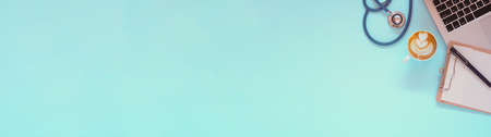 Vintage Stethoscope doctor equipment mockup on flat blue table top view background concept for hospital office workplace, isolate clinical object tool, Modern desktop laptop blank space.
