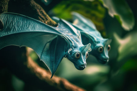 Two fantastical creatures with striking blue scales and large expressive eyes rest on a branch in a dense verdant forest. Their bat like wings are partially spread showcasing intricate textures that reflect the ambient light filtering through the foliage