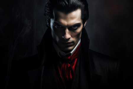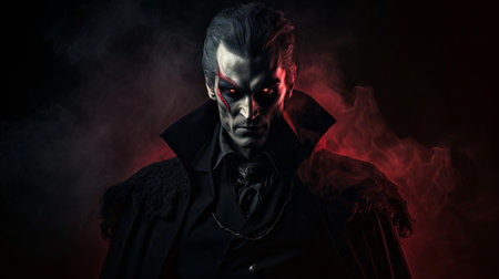 A man with glowing red eyes stares intensely in dark world evoking chilling dracula vibe on mysterious day