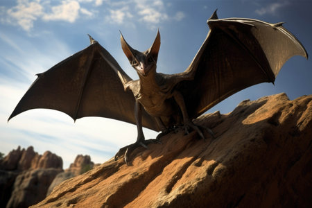 A Pterodactyl perched atop a jagged rock formation wings outstretched and eyes wide open.. AI generation