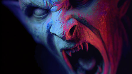 A figure with an intense expression showcases sharp fangs and dark makeup in a dramatic atmospheric setting with red and blue lighting.