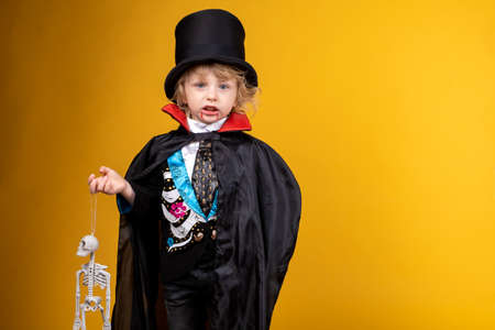 halloween, holiday and childhood concept - boy in dracula costume with black cape and top hat on his head on yellow background