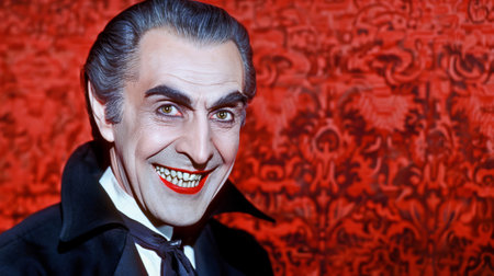 Smiling vampire with fangs in a dark red setting. Concept of Dracula, Gothic horror, Halloween character, classic monster.