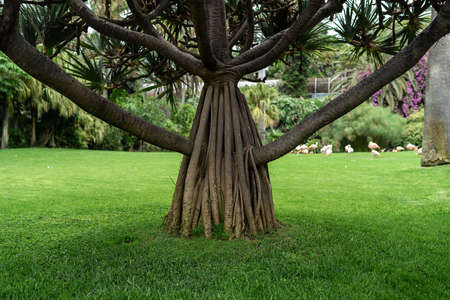 The base of the young tree trunk is Dracaena draco (Canary Islands dragon tree).