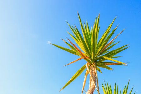 Thin sharp leaves of the dracaena tree and shadows on a blue background. Summer concept. Front view, copy space. Excellent substrate for presentations. Photo