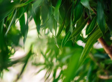 tropical looking leaves from cabbage palm outdoor in sunny backyard, close-up shot at shallow depth of field