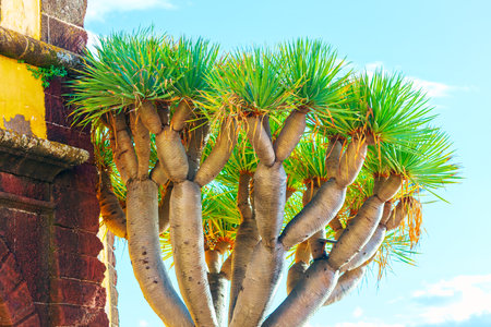 Dragon tree unique and visually striking tree with multiple thick. Tree is positioned next to a building with a yellow and red-brown exterior, adding a contrasting background to the vibrant greenery