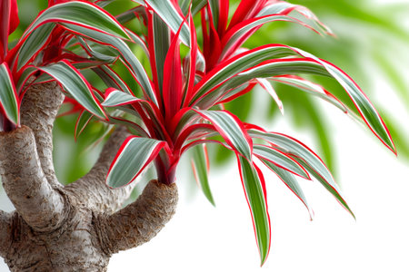 Dracaena draco plant displaying its colorful red, green, and white striped leaves