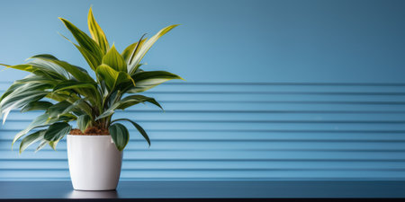 Green and yellow houseplant in a white pot on a table against a blue wall. Minimalist home decor, urban jungle concept. Copy space.