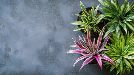 Various vibrant indoor plants are displayed on a smooth gray surface showcasing diverse leaf shapes and colors while enhancing indoor decor.