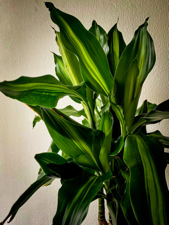 Dracaena plant with vibrant green leaves in decorative pot on white wall background, copy space to the side