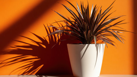 Indoor evergreen potted plant in the sun on orange background. House plants