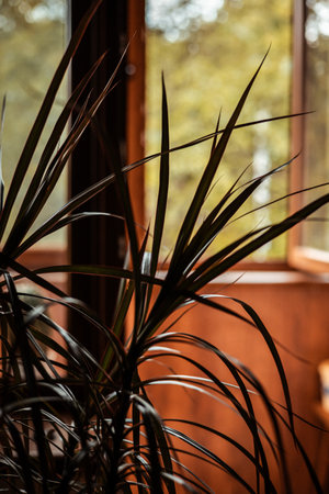 Dracaena plant against bright window, showing dark leaves. The striking image captures the elegant lines of a dracaena plant, its leaves reaching towards a sunlit window with a warm orange hue.