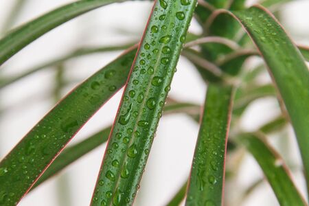 Spray water drops on the dracaena leaf, macro photo.